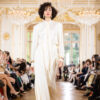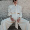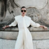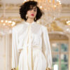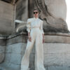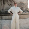 This refined ivory ensemble blends fluid tailoring with understated luxury. The silk blouse features a soft drape, structured shoulders, and an elongated tie detail that moves gracefully with the wind. High-waisted wide-leg trousers create a long, statuesque silhouette, emphasizing effortless elegance.