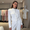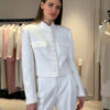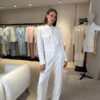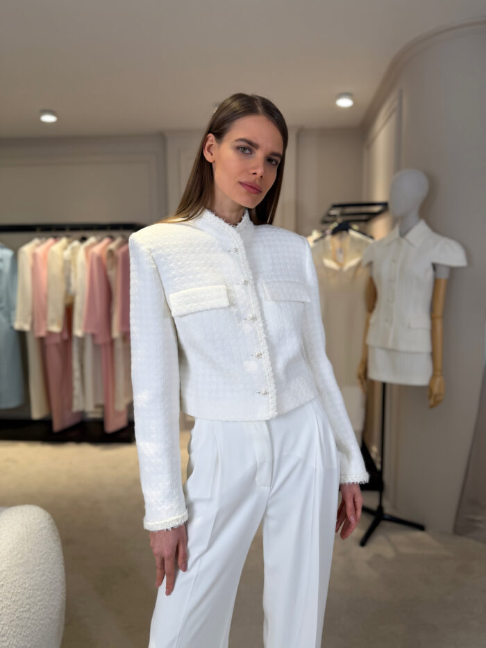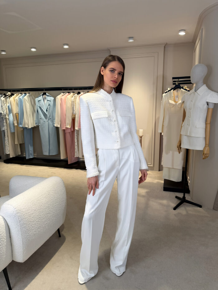 Milk-colored suit with palazzo trousers and a tweed jacket
