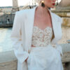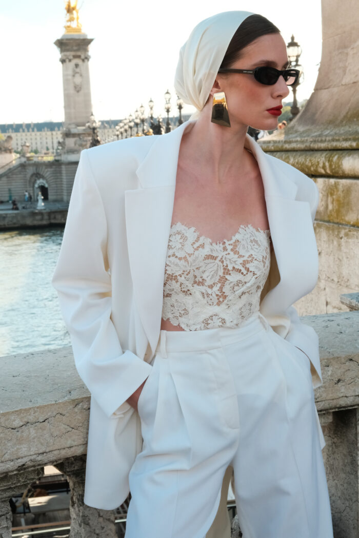 Tailored in a refined oversized silhouette, this ivory suit brings a modern, effortless elegance to evening dressing. The relaxed blazer features softened shoulders and a fluid drape, paired with high-waisted wide-leg trousers that elongate the frame. A delicate lace crop top adds a romantic contrast, creating a look that feels both powerful and femininely refined.Style the look with the Mazini lace top and a silk headscarf for a contemporary, feminine interpretation of monochrome sophistication.
