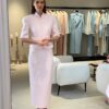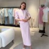Tweed suit in a soft pink color with a maxi skirt