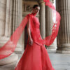This striking scarlet ensemble blends clean architectural tailoring with ethereal movement. The structured mini dress features gold-tone buttons and a refined, modern silhouette. It is paired with a detachable sheer organza skirt, which adds dramatic volume and fluidity and can be worn separately to create multiple styling possibilities. A long, flowing organza scarf completes the look, catching the wind with couture-like elegance.