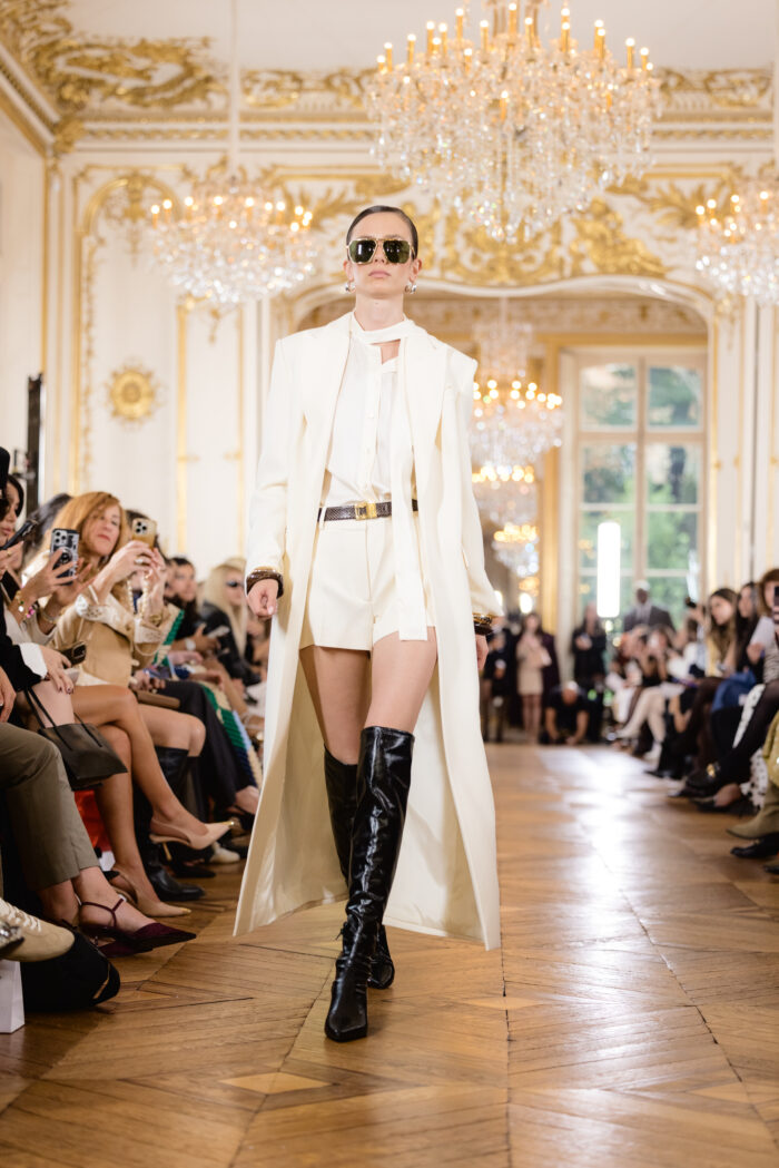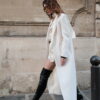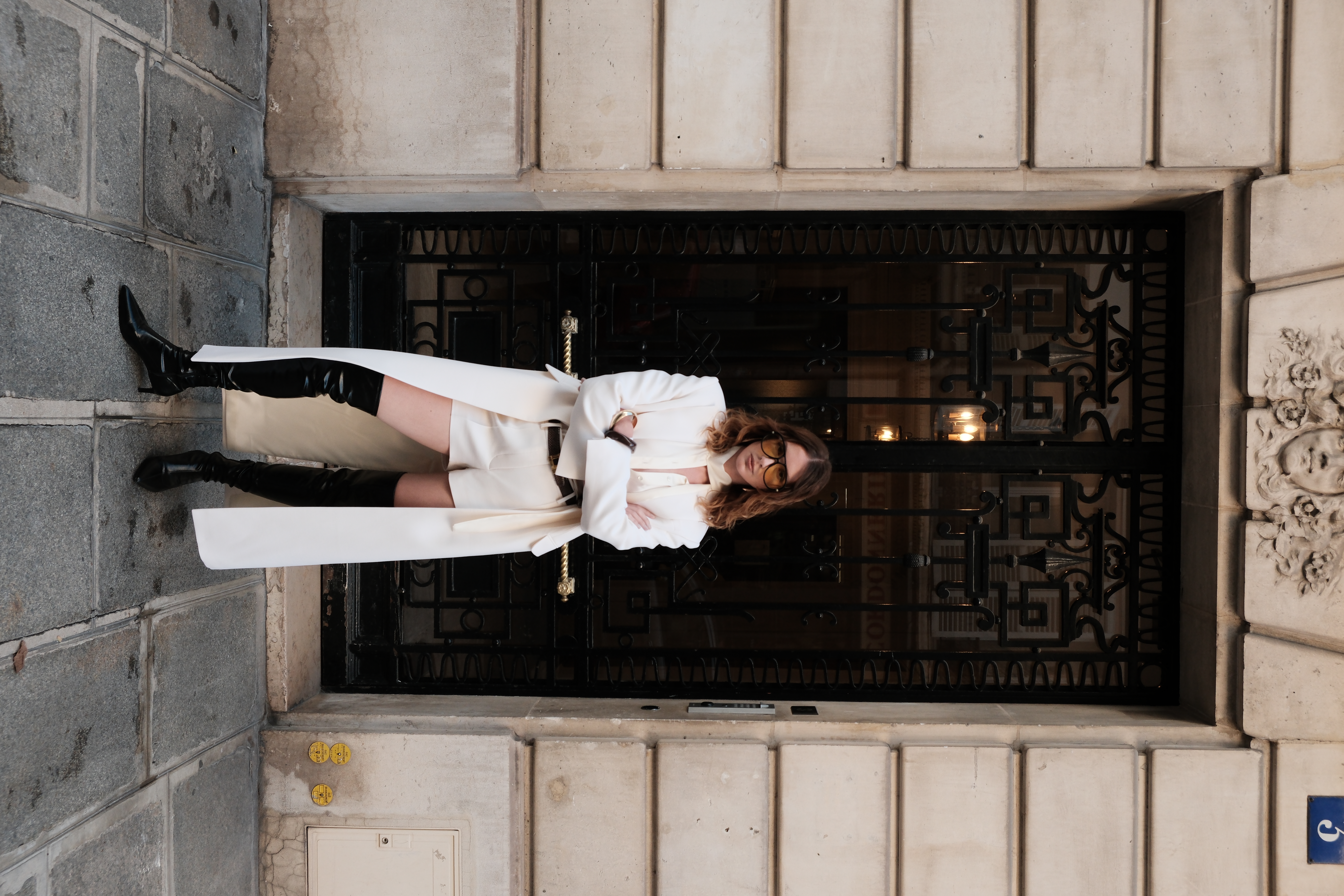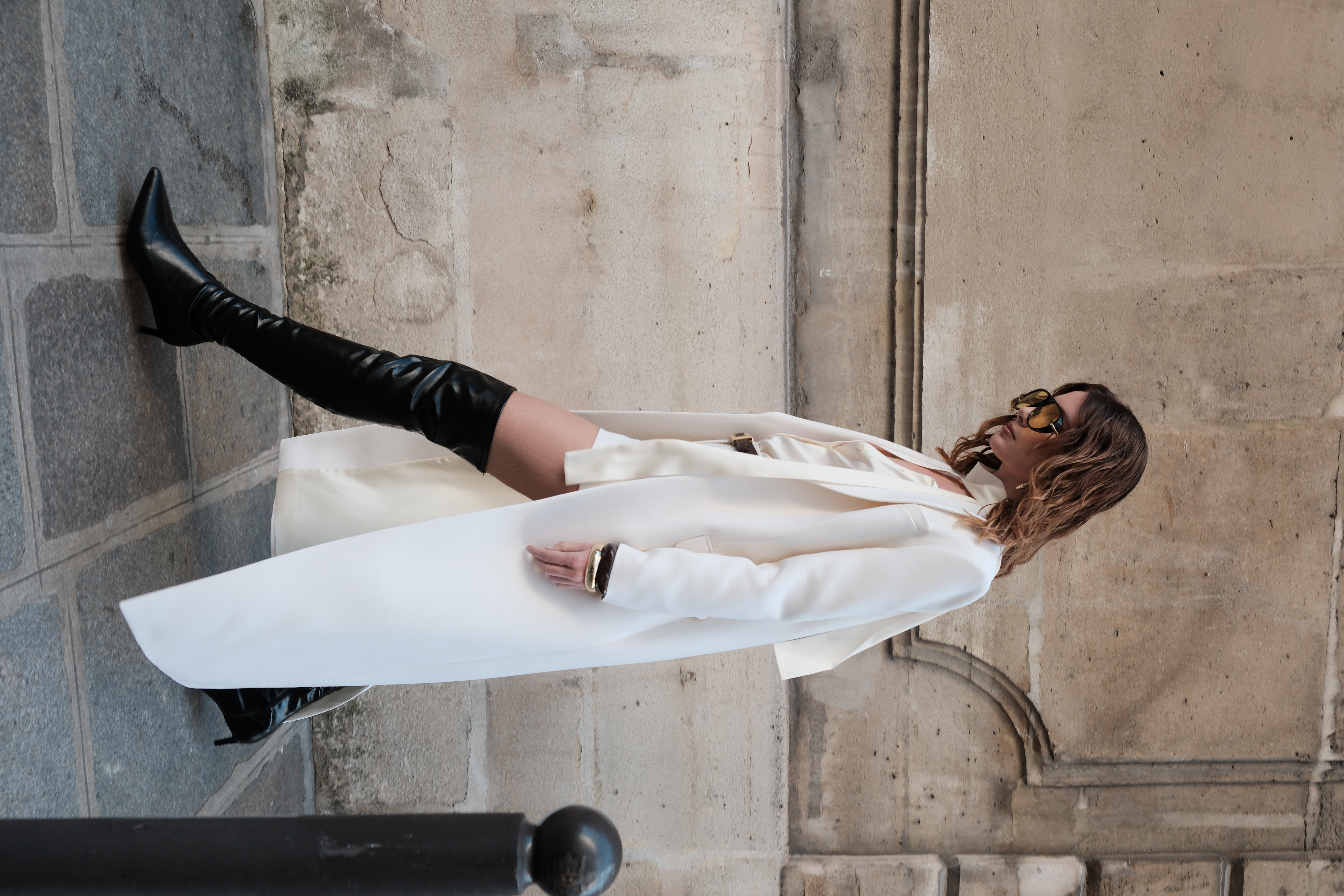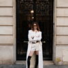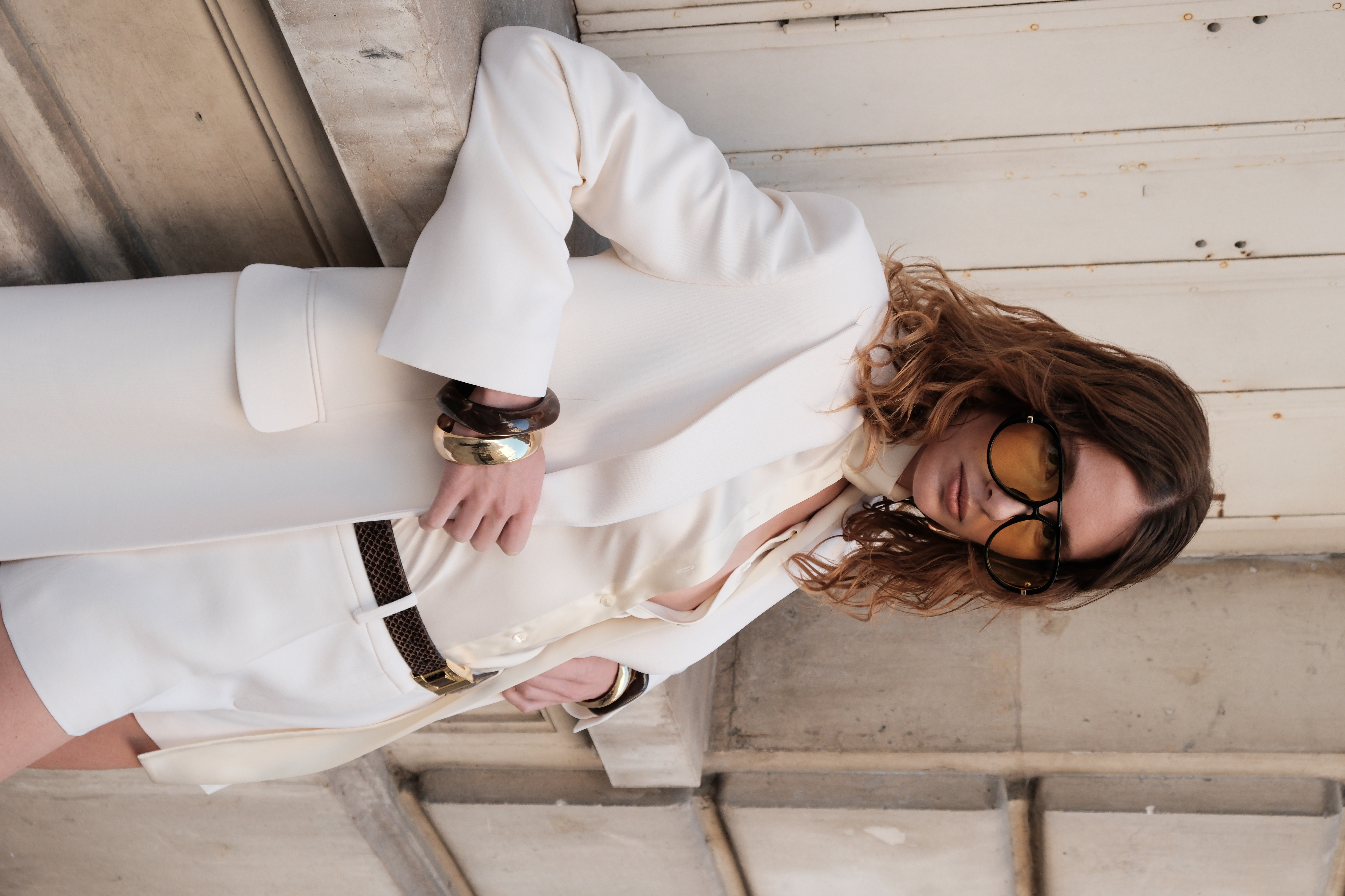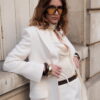 This modern ivory ensemble combines sharp tailoring with effortless sophistication. The elongated blazer drapes elegantly over tailored shorts. A textured belt with a statement buckle enhances the contemporary silhouette. The look can be styled with a silk blouse adding a polished, fashion-forward finish. Paired with oversized sunglasses and bold bangles, it radiates confident minimalism perfect for elevated daytime dressing or chic city evenings.