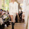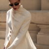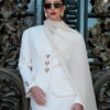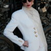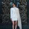 This elegant ivory ensemble pairs sharp architectural tailoring with fluid, feminine detail. The structured blazer features sculpted shoulders, precise lines, and gold-tone statement buttons, creating a refined and contemporary silhouette. It is matched with a clean, tailored mini skirt for a modern, confident look.