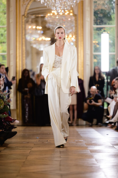 Молочний костюм із шовковою спідницею та твідовим жакетом
