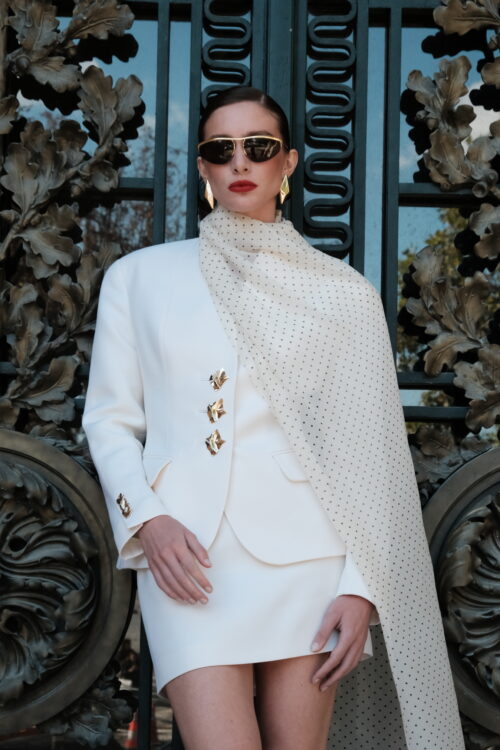 Костюм з жакетом і міні-спідницею та знімною шифоновою хусткою в горошок