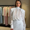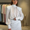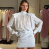 Сукня міні з драпіровкою на спідниці і довгим рукавом біла в чорний горох