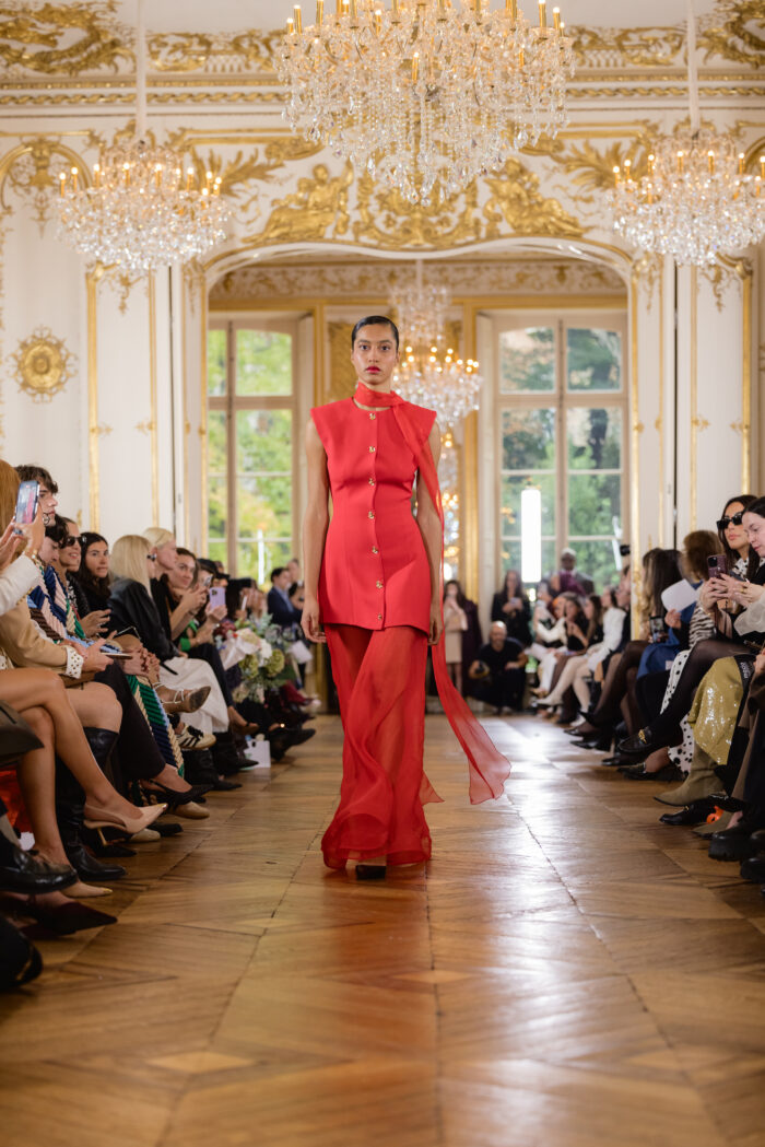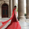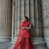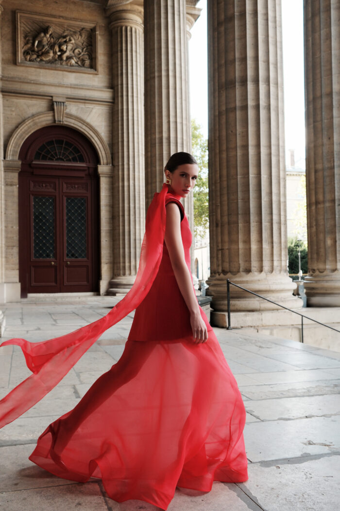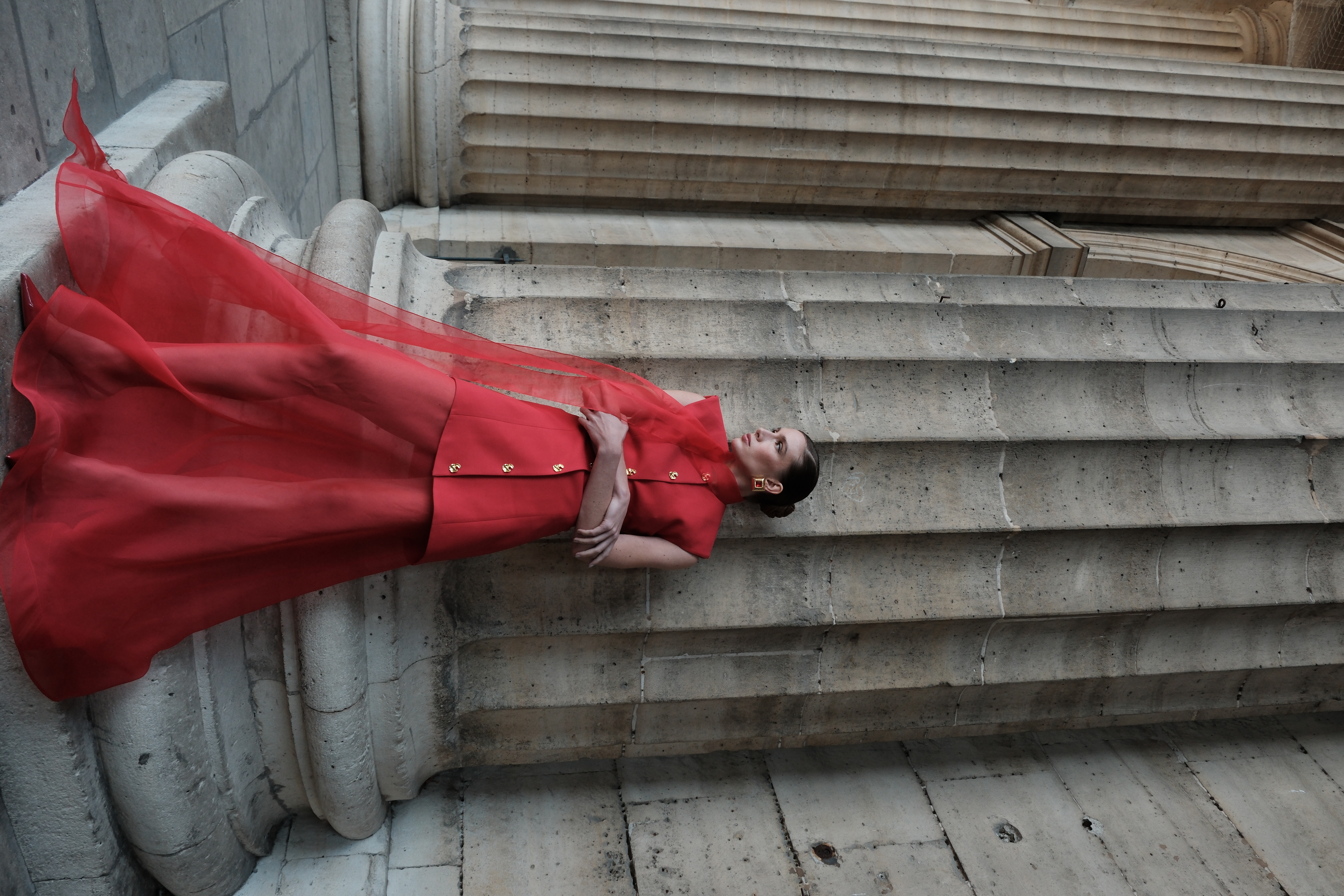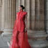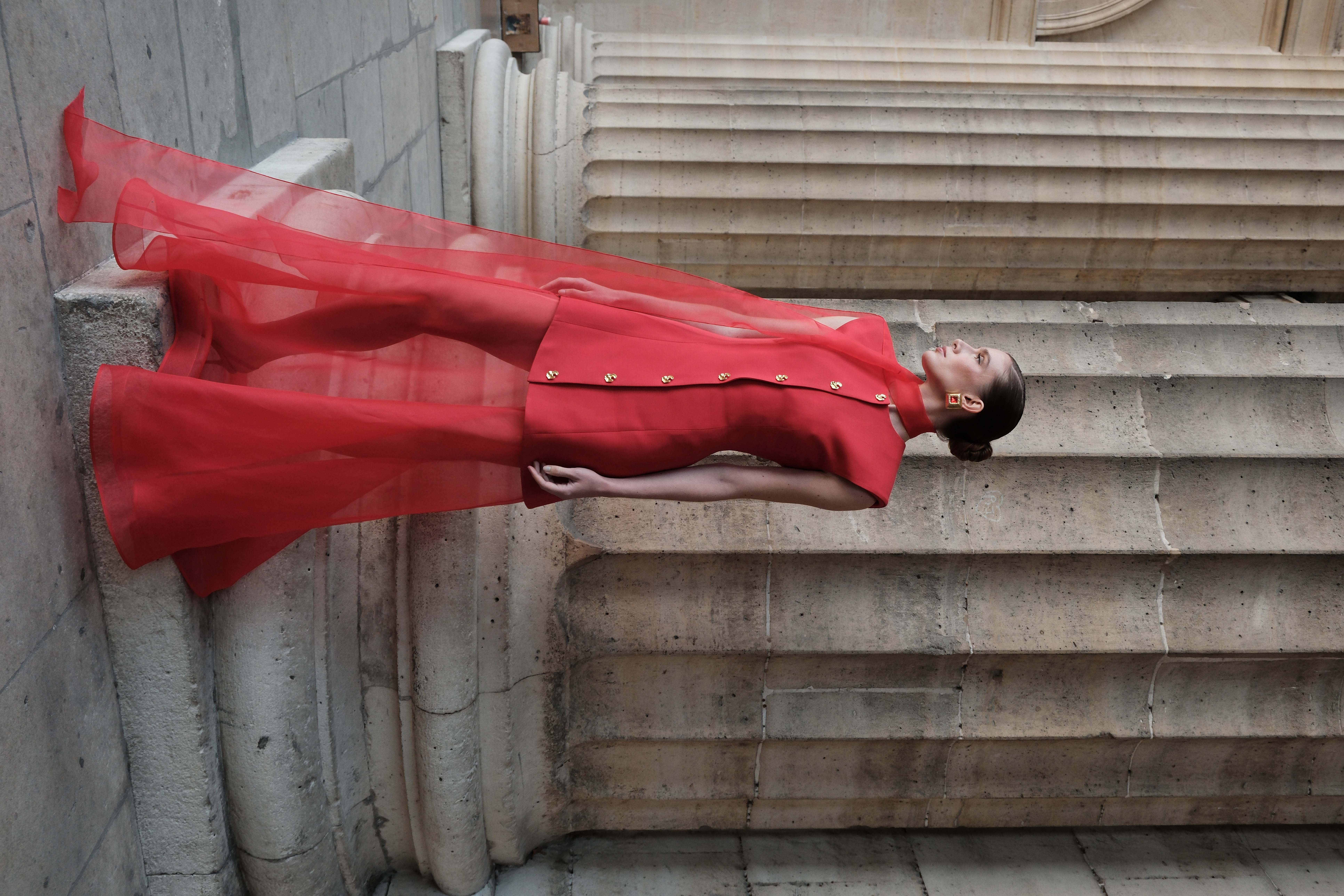 Цей яскравий червоний комплект поєднує архітектурну чіткість міні-сукні з легкою, невагомою естетикою органзи. Структурована міні-сукня, прикрашена ґудзиками золотого тону, формує сучасний, лаконічний силует. Прозора спідниця з органзи створює ефект об’єму та плавного руху — і водночас є знімною, що дозволяє носити її як окремий елемент гардеробу.